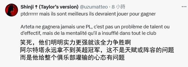 这番言论在社媒上引发了球迷的广泛讨论,很多球迷对阿尔特塔进行了批评。
