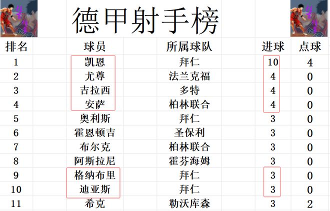 射手榜方面,凯恩今天梅开二度后,新赛季进球已经上双,凯恩已经领先第二名多达6球,凯恩这也是要终结德甲金靴的悬念。尤尊,吉拉西和安萨4球并列第2,迪亚斯,奥利斯和格纳布里今天没有进球,还是3球刚好挤入前十。