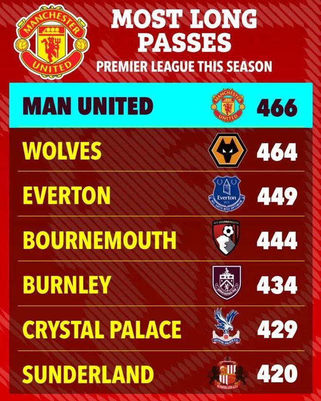 47岁的斯洛特赛后也炮轰了曼联的铁桶阵和长传战术。Opta数据显示,曼联确实是本赛季英超长传最多的球队,共有466次长传,排在联盟第一,比狼队多两次。与之对比,利物浦的长传为366次,排在第14位,瓜迪奥拉的曼城307次联赛最少。