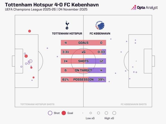 本场对阵哥本哈根,热刺全队合计打出3.31的预期进球值,是球队自2024年11月面对罗马(3.74)以来的最高预期进球数,这已经过去了58场比赛。