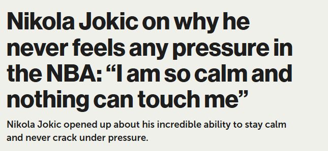 正是这种与生俱来的沉稳,让约基奇能专注于比赛本身。作为新秀,他在对阵邓肯的比赛中表现出色,砍下23分12篮板,不过当晚掘金队最终不敌马刺队。“我的意思是,我真的很喜欢蒂姆-邓肯,能和他同场竞技,对我来说意义重大,”约基奇坦言,“但当你踏上赛场,如果你总想着他取得过什么成就、他有多厉害或者他想要什么,那你这场比赛肯定打不好。你不能老想着他,得专注于自己,只需上场打出自己的正常水平就行。”久而久之,人们逐渐发现,没有什么能给约基奇带来压力,尤其是在球场上。无论赛事胜负攸关,约基奇始终保持云淡风轻的态度,这也让他在NBA赢得了一种独特的认可与尊重。对约基奇而言,篮球只是一场比赛,即便在NBA也是如此。即便有人可能不认同这位塞尔维亚巨星的心态,但毫无疑问,正是这种心态帮助约基奇成为了他那一代最伟大的球员之一。