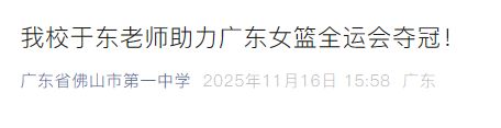于东老师(左二)在领奖台上于东老师是国家级运动健将,身高1.93米,毕业于华南理工大学行政管理系,拥有极为丰富的顶尖赛事经历:2012-2013赛季、2013-2014赛季,她代表山西队两夺WCBA(中国女子篮球联赛)冠军;2017年9月,代表广东队斩获第十三届全运会女篮冠军,凭借出色表现荣记大功,并被授予“广东省三八红旗手”荣誉称号;2025年4月,代表广东队夺得WCBA冠军。此外,她还曾先后入选国少、国青、国奥集训队,2018年更是进入国家队备战亚运会,在U16、U18女篮亚洲青年锦标赛中均助力球队夺冠,竞技实力与大赛经验备受认可。2025年7月,于东老师入职佛山一中,后因备战第十五届全国女子篮球成年组比赛,被广东省二沙体育训练中心借调为重点运动员,全力投入赛前训练。
