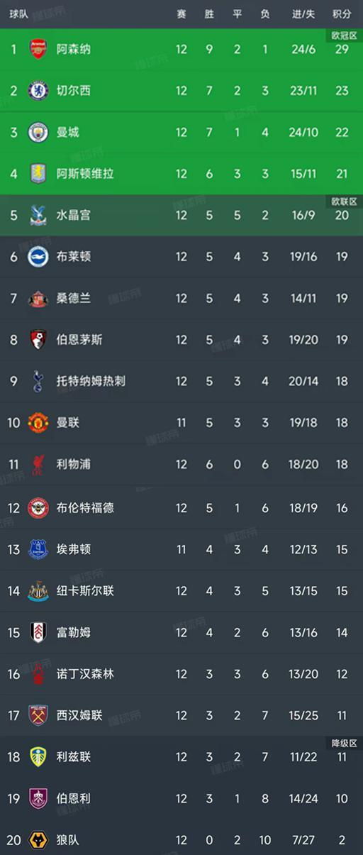 - 英超 | 英超第12轮结束了9场比赛,最新积分榜如下!