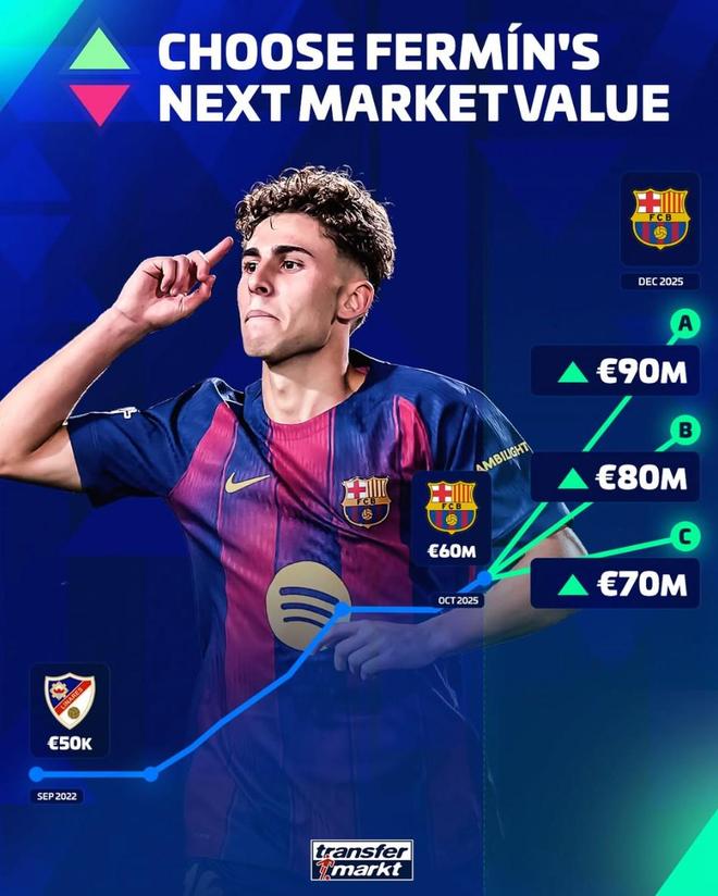北京时间11月30日,德转预热了巴塞罗那中场球星费尔明-洛佩斯的身价更新,他们给出的三个选项全都为上涨,最高升至9000万欧元。