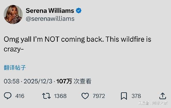 我们再来关注另一条消息。北京时间昨晚,有外媒报道,称在退役三年多之后,23届大满贯冠军得主、美国黑珍珠小威廉姆斯有可能在明年复出,重返赛场。理由是小威的名字被重新列入国际网球诚信机构(ITIA)最新的国际注册检测名单之中。而根据规定,球员必须加入该名单才能参赛,而复出的退役球员也必须在复出前至少六个月完成注册,接受赛外兴奋剂检测。在各方纷纷猜测之际,小威亲自出来辟谣了,她称,“我不会再回来”。