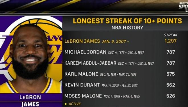 - NBA | 连续1297场得分上双!明明无人可破的纪录,为何老詹还要继续刷新