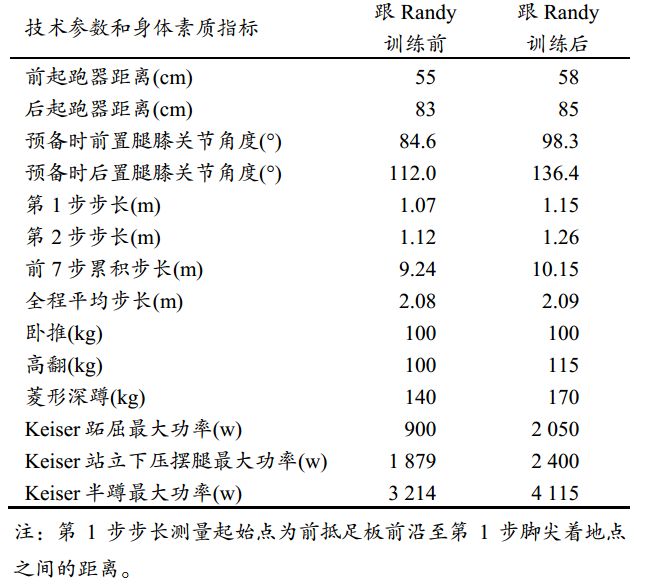 跟随兰迪训练前、后苏炳添部分技术参数和身体素质对比丨参考文献[1]