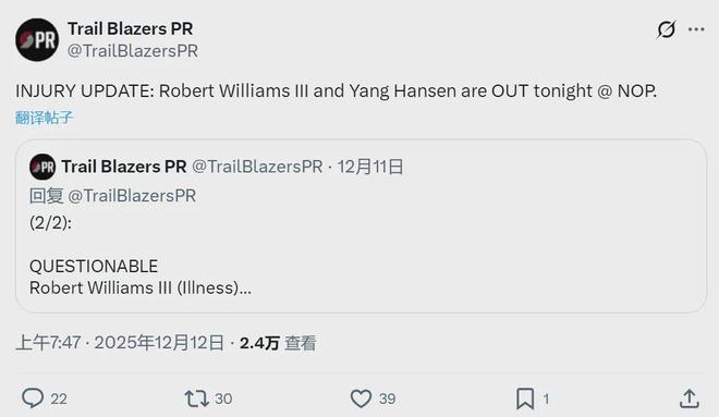 北京时间12月12日,NBA常规赛:鹈鹕主场vs开拓者。赛前开拓者官方宣布:杨瀚森(面部挫伤)和罗威(生病),今天休战。这是杨瀚森进入NBA之后,生涯第一次因伤缺席比赛。今天克林根也不打,小杨没受伤的话本来是个机会。