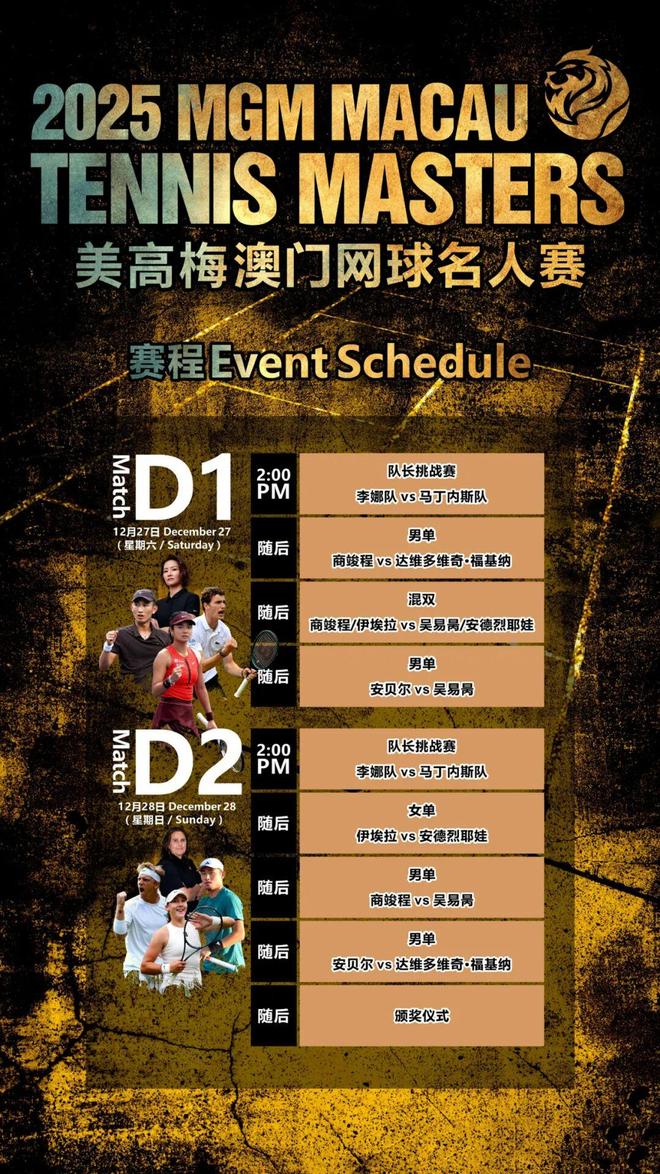 2025美高梅澳门网球名人赛将于12月27-28日在澳门综艺馆盛大举行!亚洲冬季最炙手可热的网球盛事即将开打。同为国际网球名人堂成员、大满贯单打冠军的李娜与马丁内斯两位传奇名将,将率领网坛新生代球员展开精彩对决!