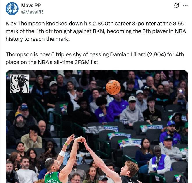 同时距离超越利拉德(2804记)升至NBA历史三分命中榜第4位,仅差5记三分。